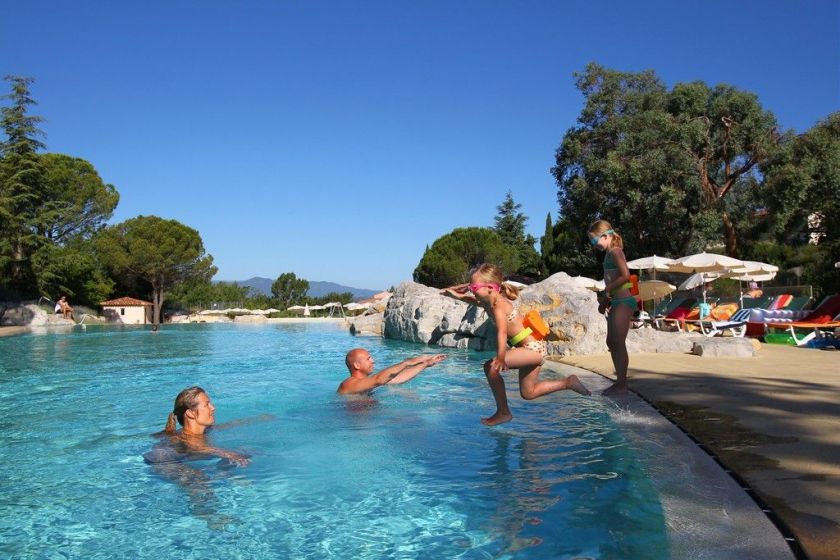 › Une piscine extérieure de 350 m², ouverte en juillet/août (profondeur maximale de 3,50 m) aménagée avec deux bassins (un bassin de nage et une piscine-plage) ainsi qu'une pataugeoire pour les enfants (profondeur de 0,30 m) : ouvert en juillet/août uniquement
